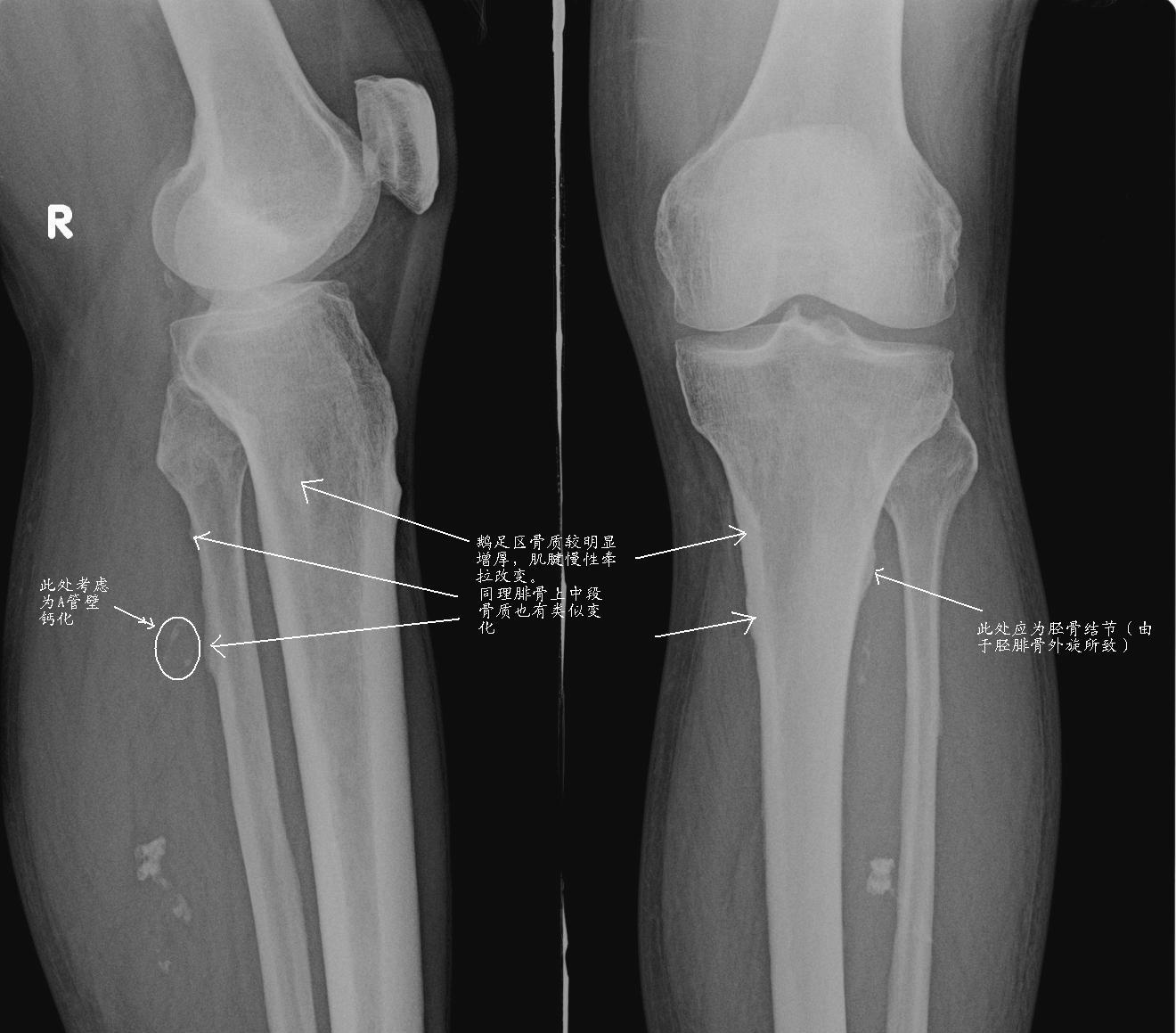 [br]考虑小腿软组织血管瘤或avm伴胫腓骨中上段局限性骨皮质增生,右膝关节退变。