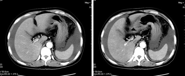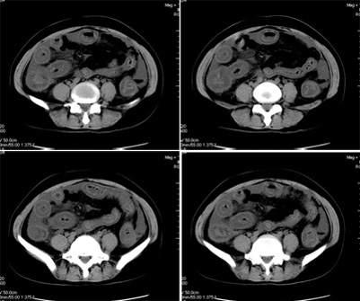 以下是引用jiangjing在2006-8-18 18:42:00的发言:[br]真是少见!至少本人从未见过!整个消化道除了胃壁以外整套小肠及结肠肠壁均不同程度增厚水肿,增强明显分层[粘膜层及浆膜层明显强化,粘膜下层强化轻]。结合病史考虑肠道缺血改变[病因待查--血管炎,结缔组织疾病等]
