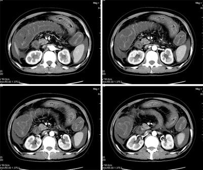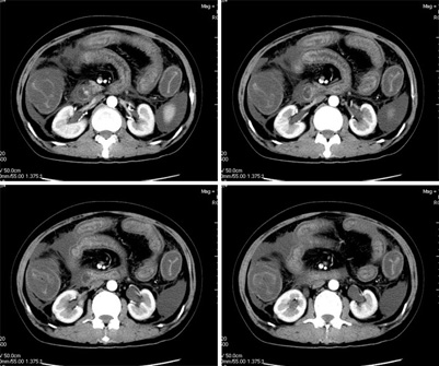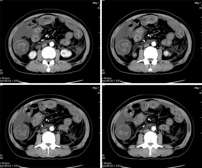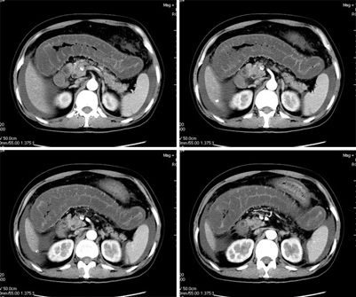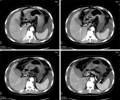 我们仔细看了三期增强的动静脉血管,未看见血栓的形成,因为三期的片子太多有168张,无法全部上传,在动脉期及静脉期看到下腔静脉及门静脉内密度不均匀在平衡期均显示均匀,所以不考虑血栓形成引起的回流障碍.刚才老公在电脑边走过(他是外行),发表意见说这人是不是吃了什么东西引起肠子中毒.我想了一下似乎有道理,但是是什么东西会引起这样的改变,并且从病程上来看有一个多月的病史,又不是急性发作,网上高手们给予指点,如需要更多的另两期的图片,我将上传.