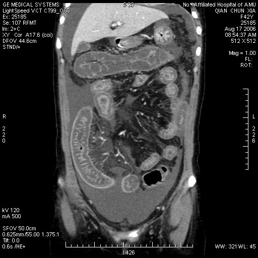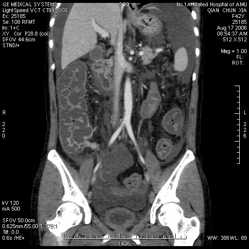 肠管全程水肿,向心性狭窄,冠状面重建显示门脉好象相对粗一些,增强扫描没有上传静脉期图象,不知道腔静脉肝段和肝静脉是否正常?是否有静脉回流异常??