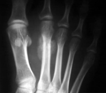 第2跖骨中段见骨皮质硬话,骨膜反应.外侧见稍高密度影.