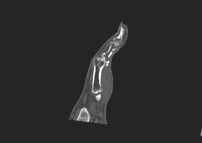 请见指骨骨折ct矢状面重建图象观察骨折细节: