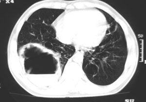 以下是引用卜一在2006-8-26 15:32:00的发言:[br]右下肺巨大气液囊肿,局部与支气管相同,壁厚薄不均,周围见渗出性病变,相应胸膜增厚.多考虑:支气管囊肿合并感染.