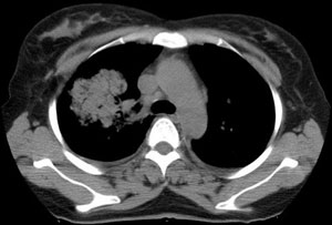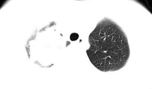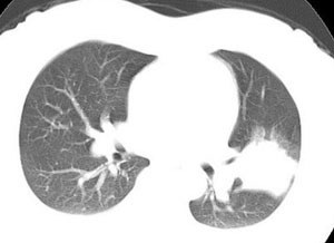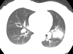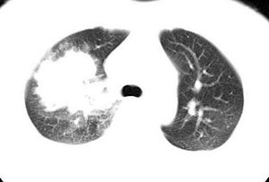 哎呀,昨天还真遇到一个与此极类似的ct片,我考率感染性病变,但也同时将肺炎型肺癌放在了第2位,待排除!盼结果.