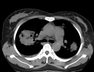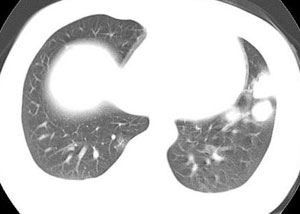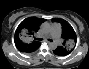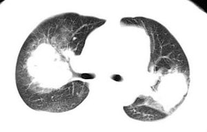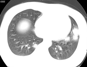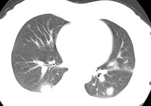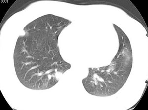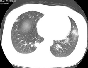 两肺多发斑片及节结灶,其内有支气管充气症,比较年轻考虑为感染或肺泡癌