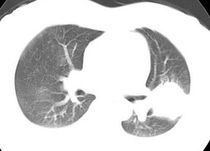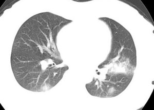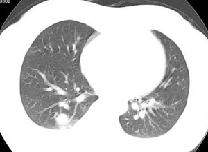 影像学表现:1、肺内结节状阴影,可为单发或多发结节,边缘锐利或模糊,大小约2~4cm左右;2、表现为斑片状阴影,双侧或单侧分布,密度较低,边界不清,有时可见支气管充气征,此阴影可自行消失或具有游走性特征;3、间质性病变,表现为弥漫性网状阴影或结节状阴影、间质性浸润;4、胸膜肥厚或积液;