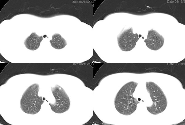 以下是引用jiangjing在2006-8-29 20:10:00的发言:[br]x线平片:左肺中野可见一约15mm*15mm的高密度影.[br] ct图像所见: 左肺下叶背段可见一直径约2.0cm类圆形肿块影,边缘模糊,有浅分叶,肿块周边可见沙粒样高密度影,肿块内可见空泡征,气管主支气管通畅,纵隔内未见明显肿大淋巴结影。 [br]诊断意见:左肺下叶背段可见一直径约2.0cm类圆形肿块影,肿块周边可见沙粒样高密度影,再结合2型糖尿病8年。多考虑:结核瘤。后经化验 ppd实验(++)[br]支持版主的考虑,病灶周围可见小点结影可疑卫星灶,但不完全除外肿瘤。建议增强及穿刺活检