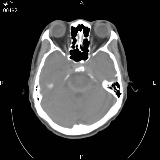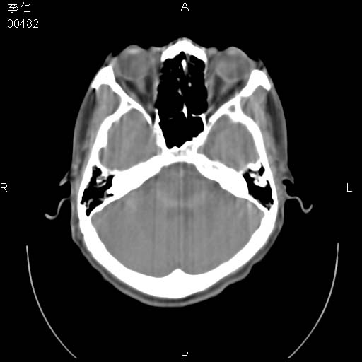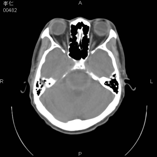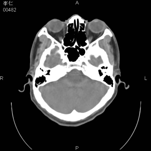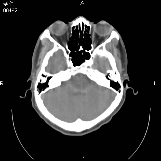 患者男,45岁。于二月前发现左眼稍肿,去看眼科,查肾功(—),来查ct,我看到的是左侧上眼睑内低密度影,ct值是-600到-700hu。