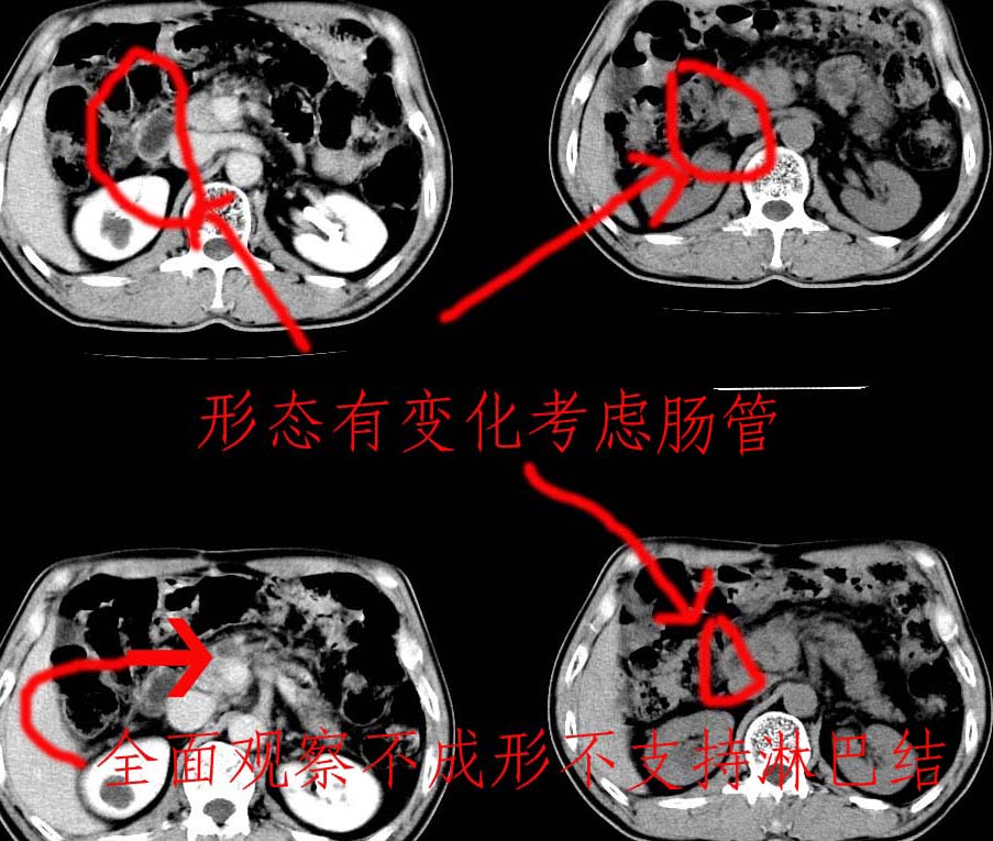 患者男,64岁,胃癌术后三个月,无明显不适。请讨论一下胰头前方小圆形低密度影为淋巴结还是肠管?