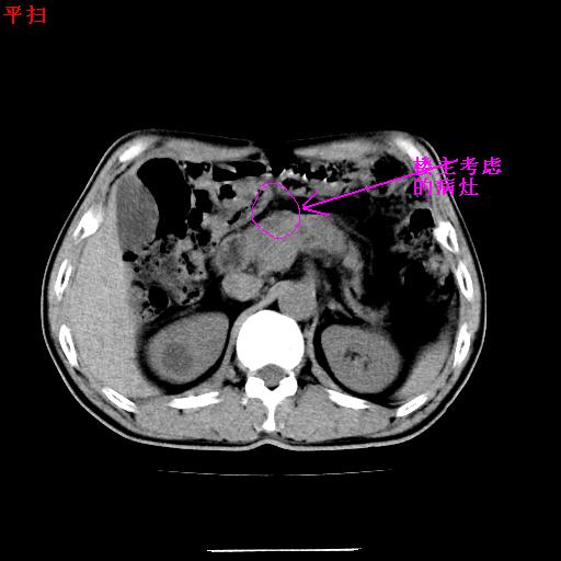 另外,胰腺体部密度在平扫和增强时均不太均匀,似有数个小的囊状低密度区存在。不知道增强时其他期如何?应该高度警惕为转移性病变。