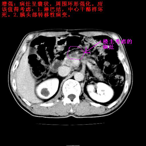 胰头右侧低密度影卡考虑为肠管;胰头前部低密度影,增强环形强化,结合临床首先考虑转移灶,其次考虑淋巴结结核(中心干酪性坏死)。