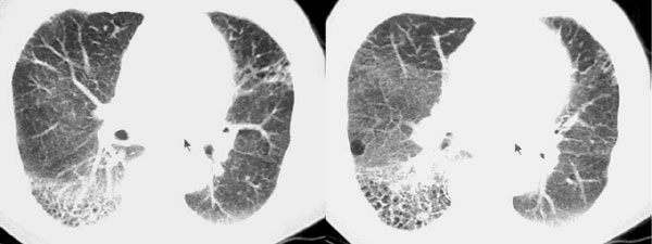 以下是引用dyqct在2006-9-10 13:57:00的发言:[br]右肺下叶呈蜂窝状改变;左且舌段亦见多数条状高密度影,边界不清,下叶见多数磨玻璃样影,并可见胸膜下线。[br]考虑:间质纤维化(后期改变,蜂窝肺)伴感染、支气管扩张。