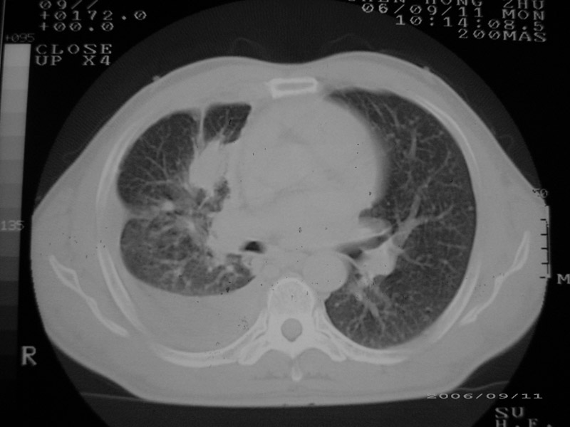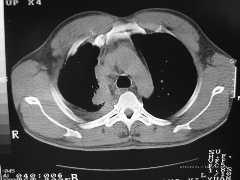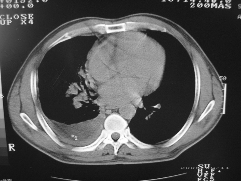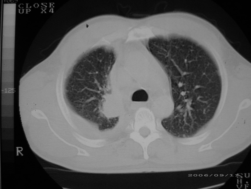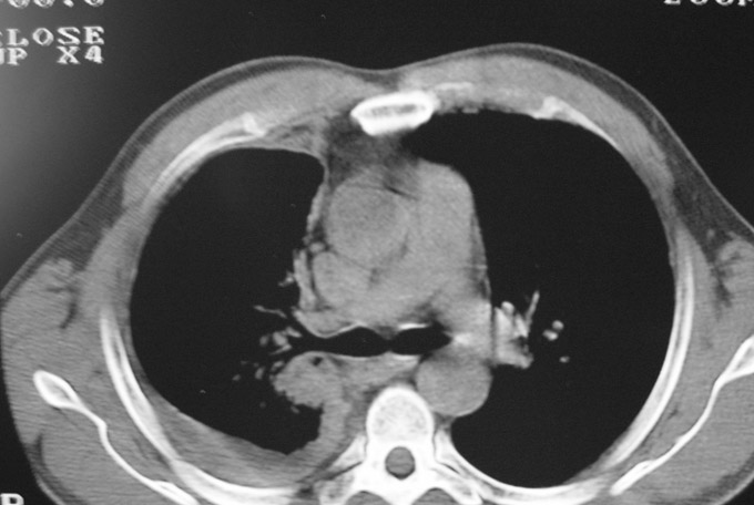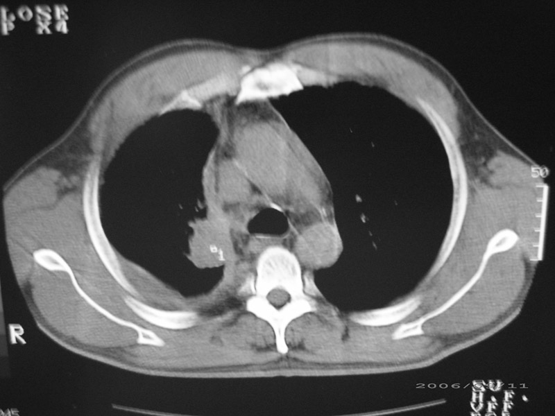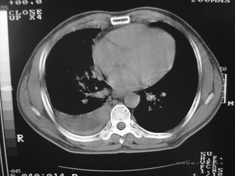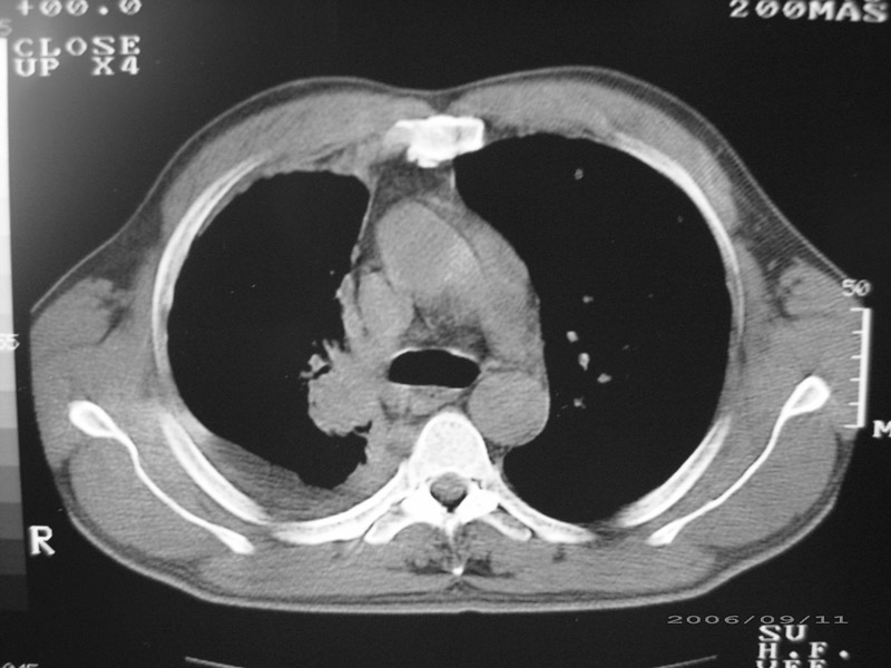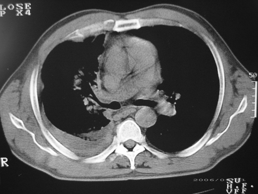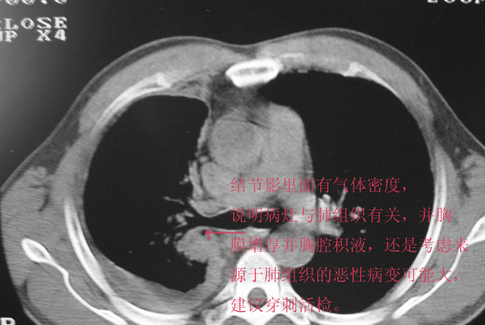 以下是引用守望可可西里在2006-9-11 15:29:00的发言:[br][br] ct平扫表现:右侧胸膜腔缩小,积液,胸膜增厚且不均匀、不规则,以纵隔胸膜增厚为主,边缘呈锯齿状,并见附壁内突之结节状肿块影。右肺含气量减少,纹理聚集,右肺门中下部见数个肿大的淋巴结。纵隔无移位,内未见明显肿大淋巴结,双侧主支气管以及各叶、段支气管比较通畅。。[br] 考虑:右侧胸膜恶性间皮瘤,伴肺门淋巴结转移。