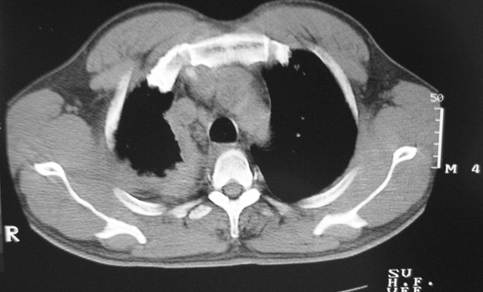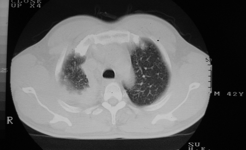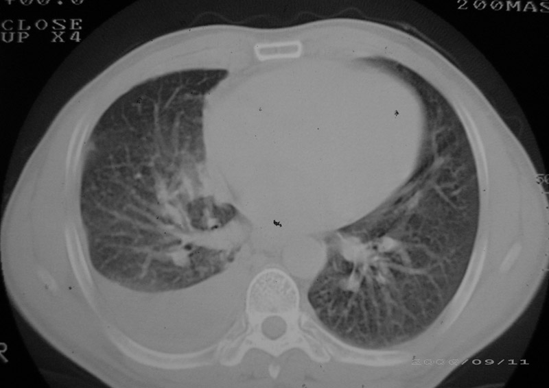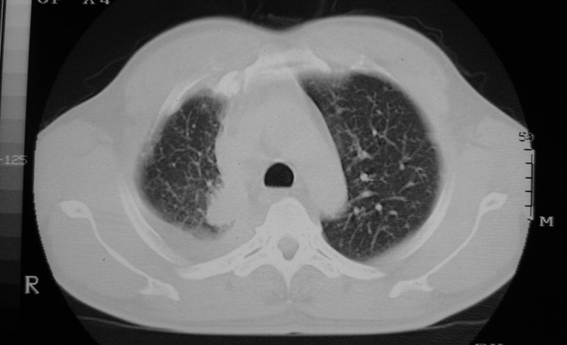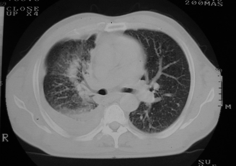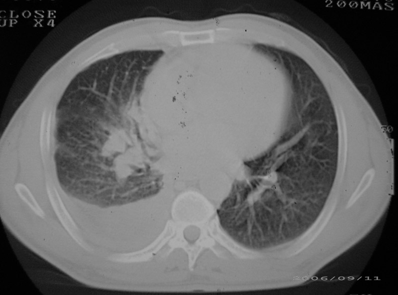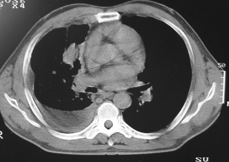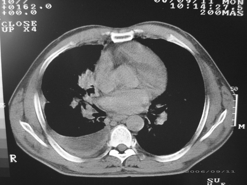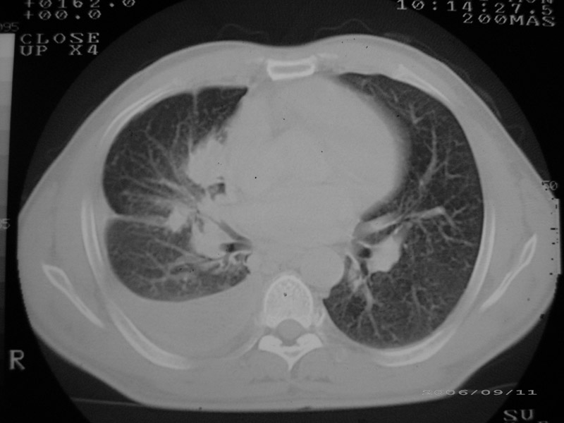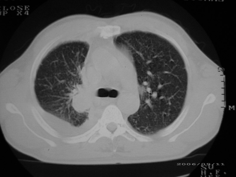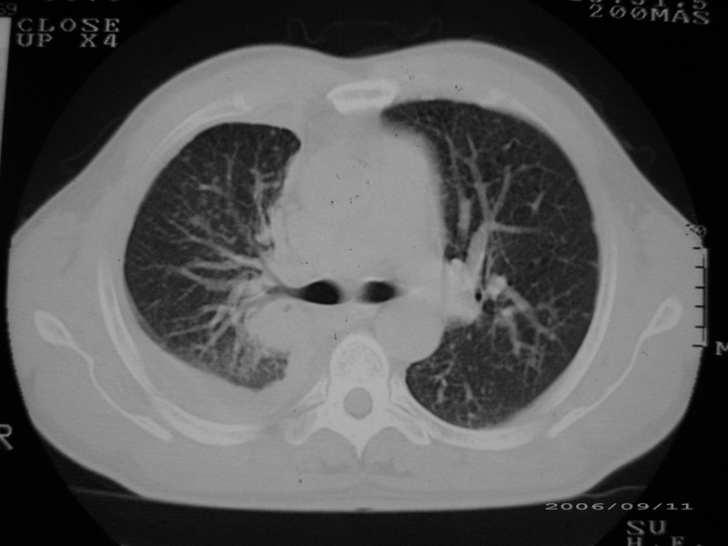 以下是引用守望可可西里在2006-9-11 15:29:00的发言:[br][br] ct平扫表现:右侧胸膜腔缩小,积液,胸膜增厚且不均匀、不规则,以纵隔胸膜增厚为主,边缘呈锯齿状,并见附壁内突之结节状肿块影。右肺含气量减少,纹理聚集,右肺门中下部见数个肿大的淋巴结。纵隔无移位,内未见明显肿大淋巴结,双侧主支气管以及各叶、段支气管比较通畅。。[br] 考虑:右侧胸膜恶性间皮瘤,伴肺门淋巴结转移。