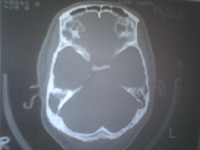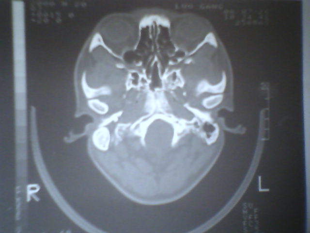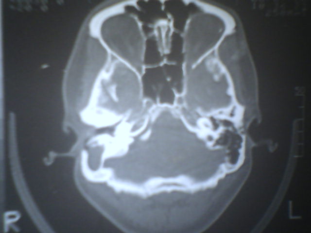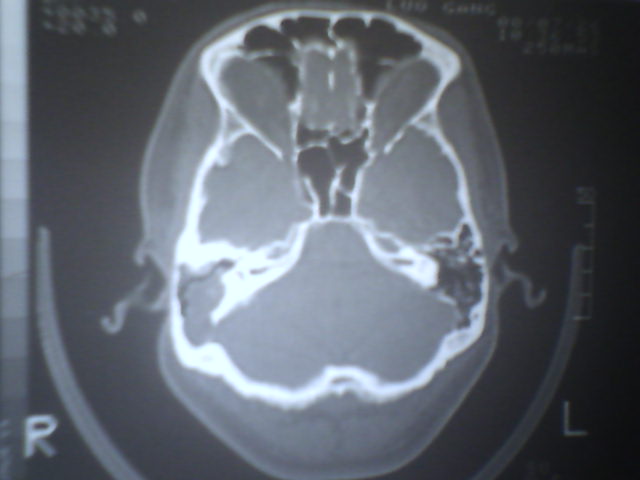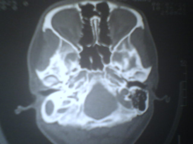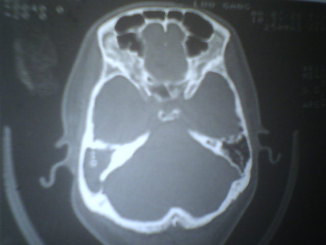 本例具有以上所有征象,可惜图像质量欠佳。其一,乳突扫描不能用头颅模式。其二,照像时后面光线太强。