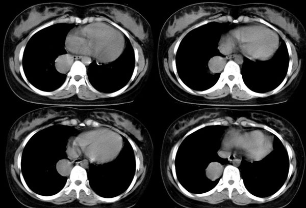 自己分析一下误诊的原因,如果不对,请老师们指正:该肿瘤位于支气管分叉处,附着于右主支气管后外壁。因为病灶逐渐长大和重力的关系,呈水滴状下垂,故造成其最大径不在纵隔内的假象。轻度强化也是没有仔细和平扫对比给自己造成的假象。才疏学浅,没有仔细分析病例,也没有仔细体会各位老师的不同意见,草率之至,羞愧!