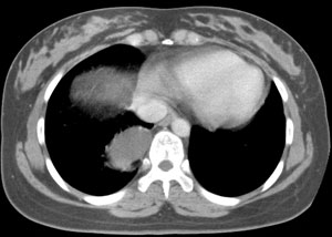 首先定位在肺内。肿块最大径在右下肺叶后基底段,胸椎椎体右边偏后部。与气管、食管无关,如果是支气管或食管囊肿应该有细蒂与之连接。肿块边缘光整、密度均匀一致、轻度均匀强化。右主支气管轻度受压,右肺含气量降低,右胸腔略萎陷。