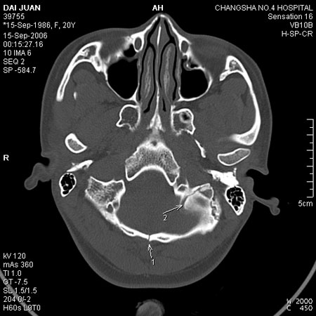 患者男,19 岁。因头部外伤就诊。体检:营养、发育良好,五官对称,外观无畸形。右额部见局部皮肤青紫,无皮肤破损。ct 扫描:脑组织及颅外软组织未见异常;骨窗见枕骨中下部,由枕骨内、外隆凸至枕骨大孔处有一线样长约27 mm裂隙(图1、2),宽约1 .0 mm。边缘光滑、硬化,贯穿枕骨内外板。颅骨无