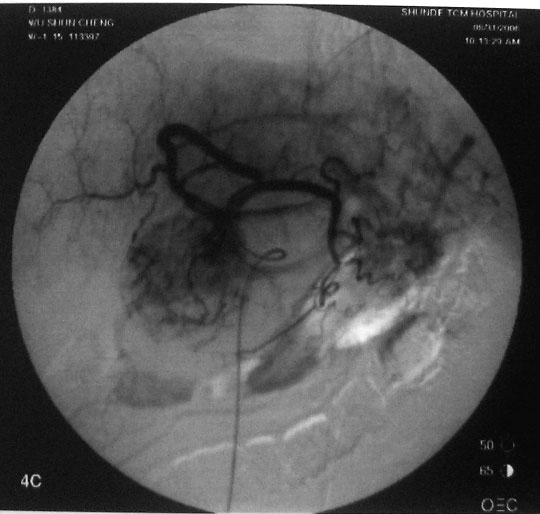 图4:栓塞治疗后,肿瘤已为化疗药+碘油混合剂充填。