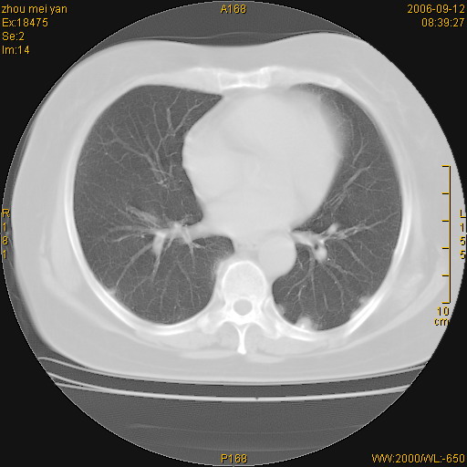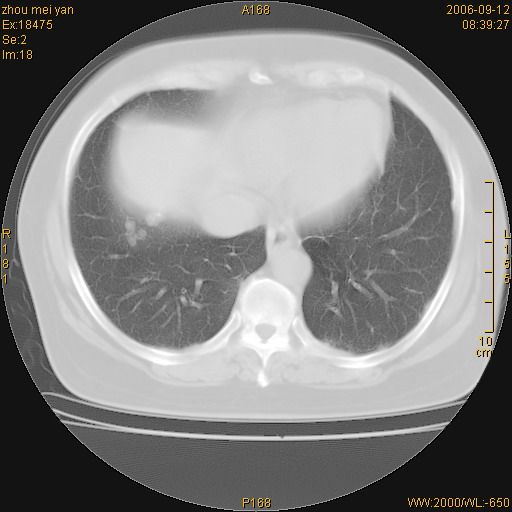 患者、女、55岁。因心率失常住院检查ct发现胸部多发结节。腹部b超肝、胆、胰、脾、肾、子宫附件未见异常。无结核病史,无粉尘接触史。请大家来会诊。谢谢!