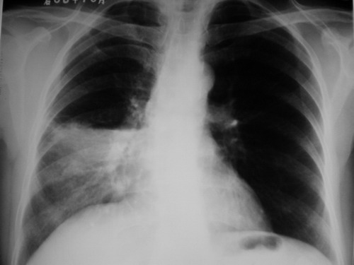 5月见过一个类似的片子,也是右肺中叶实变,患者50多岁,男性,以咯血2天为主诉拍片,临床血象不高,无发热等症状,当时报的是"考虑右肺中叶炎症,抗炎治疗后随诊,以排除其它."没敢说死.随诊胸片阴影吸收.现在很多病已不典型了.希望各位参考.