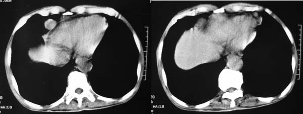 右侧肾上腺区软组织肿块影,密度不均,其周围及腹主动脉周围,心包周围均见多个淋巴结肿大.结合临床首先考虑:右肾上腺恶性肿瘤伴腹腔内及心包淋巴结转移.