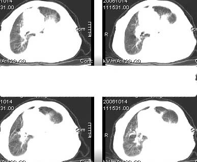 以下是引用奕帆在2006-10-15 23:28:00的发言:[br]1、高度怀疑:左肺中央型肺癌伴肺不张、胸水;[br]2、肝上病灶暂考虑囊肿。[br]3、心包内脂肪影清晰,未见积液。[br]请提供临床其它资料。