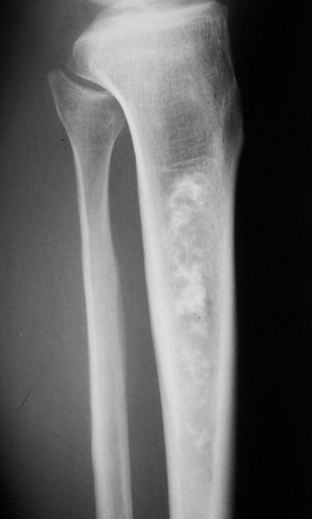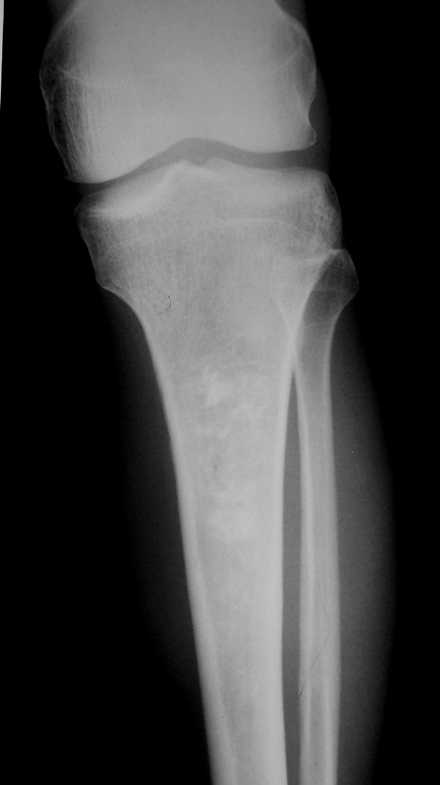 胫骨上段可见斑片状高密度影,密度不均,边界欠清,邻近骨质无破坏,无骨膜反应,周围软组织无肿胀。