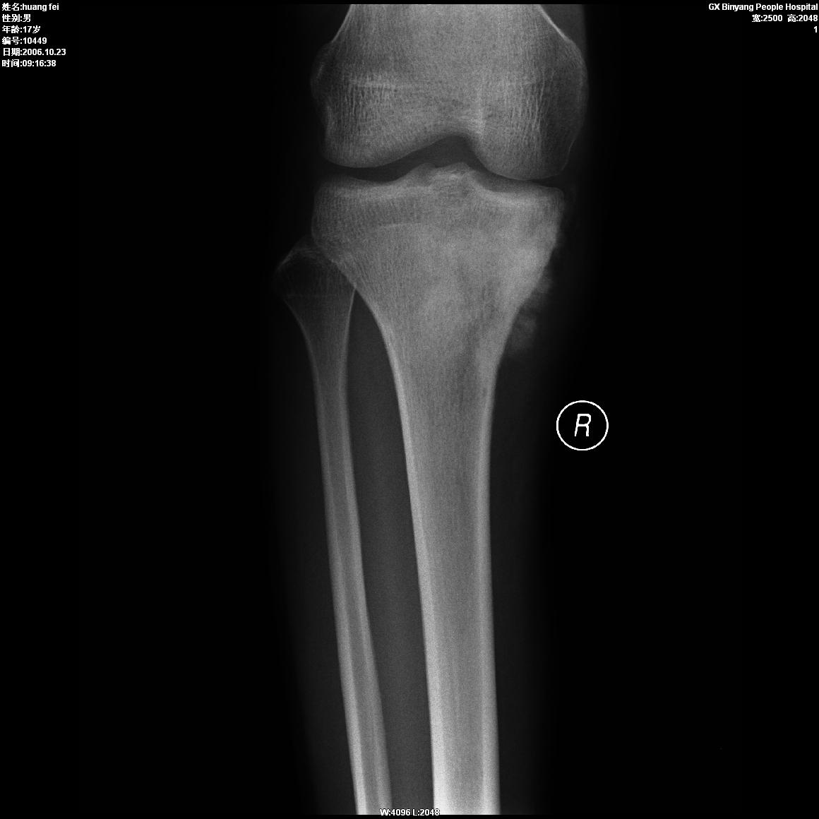 以下是引用zrs在2006-10-23 21:27:00的发言:[br]性别 年龄呢 侧位片呢 有什么临床资料给点行吗[br][br]单就影像看 胫骨近侧干骺端放射状骨膜反应,有成骨肉瘤的可能。还请楼主补充资料