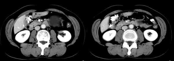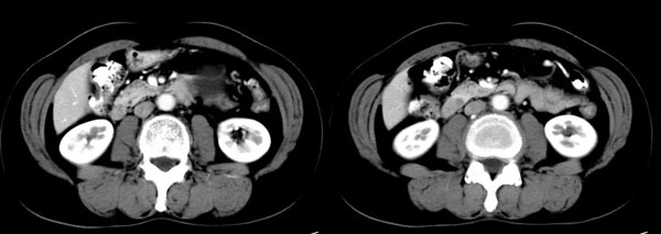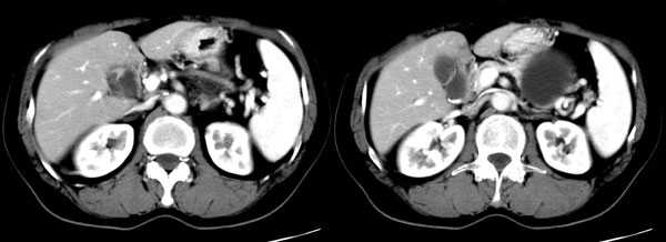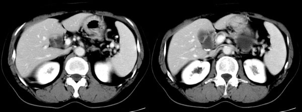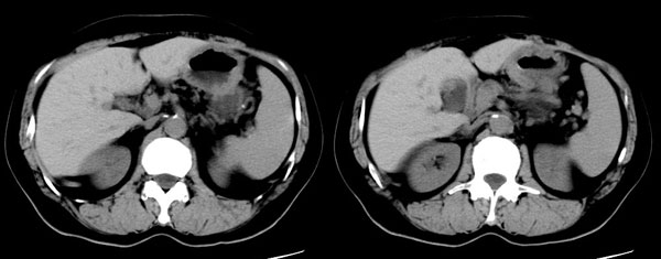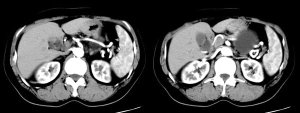 参照ct片,经皮穿刺,抽出透明液体60ml,随后置入引流管引流,囊液细胞学检查阴性,胰酶检查阴性。采用无水乙醇灌注治疗。4天后囊腔闭锁,无液体渗出,予以拔管。