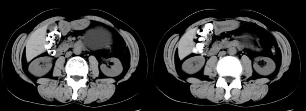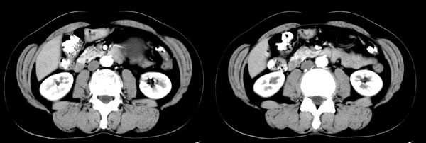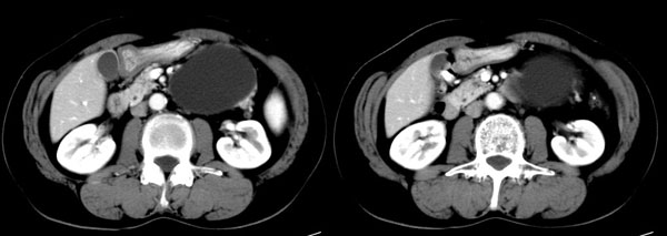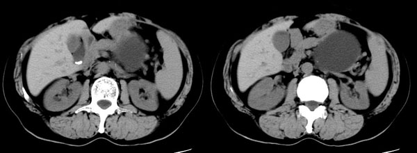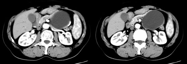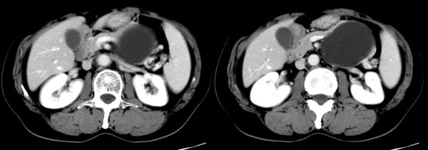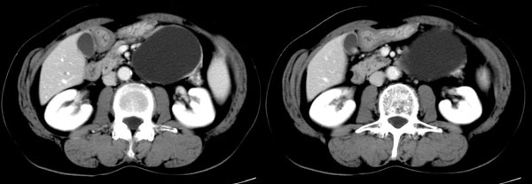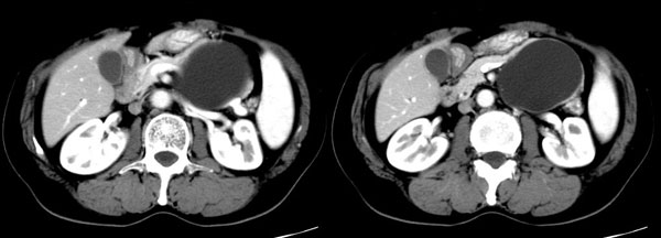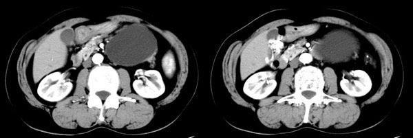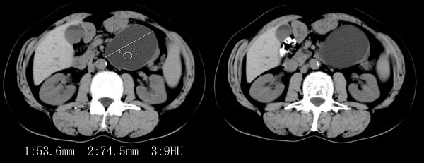 :胆囊折叠,壁厚,其内见结石。胰腺体尾部见一5.8x7.5cm囊性肿物,ct值12hu,壁薄,增强扫描未明显强化,胰头不大,强化均匀。