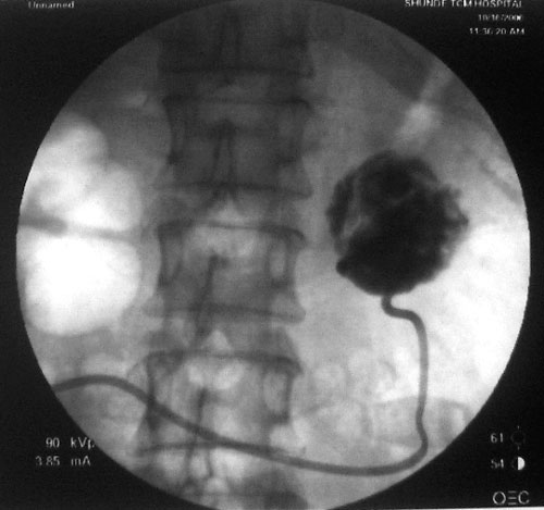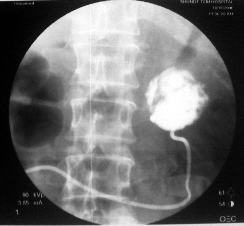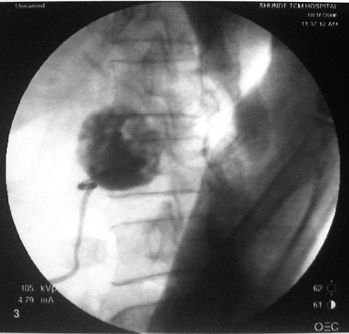 置管后造影,显示囊腔直径约5cm,囊壁光整,正位、双斜位造影均未见造影剂外溢,与胰腺无交通