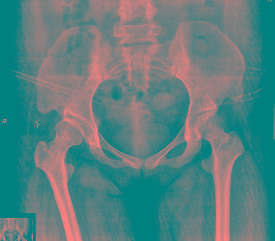 女.29岁.先天髋关节脱位.腰椎后部向外膨出.外院诊断骨肉瘤.我院诊断夏科氏关节病。