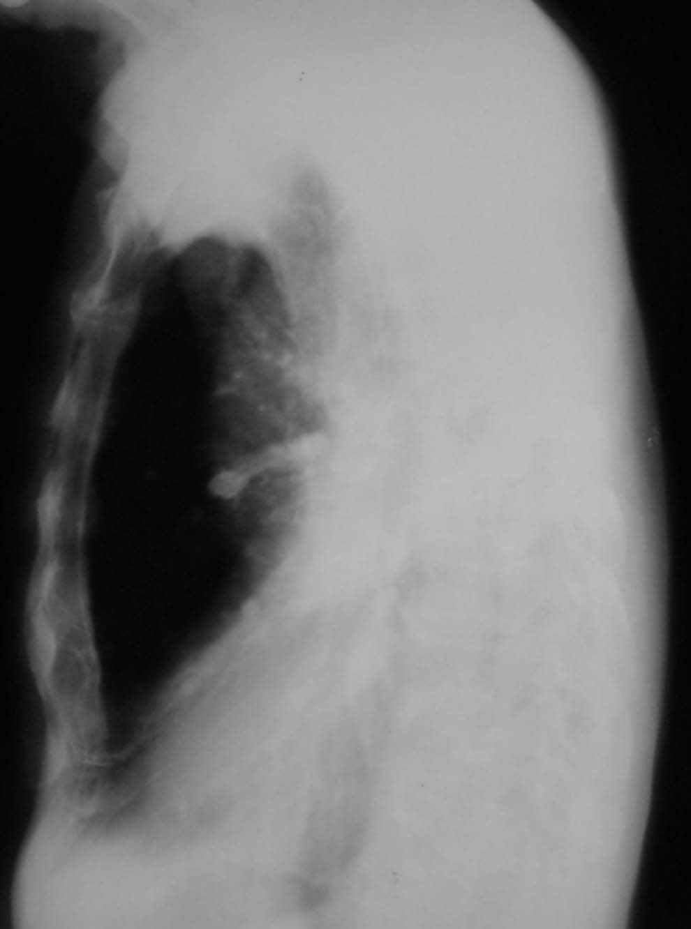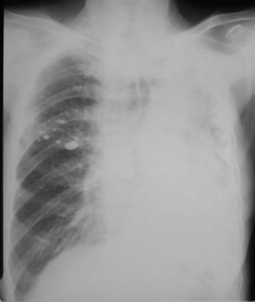 以下是引用jian-5587在2006-11-3 19:10:00的发言:[br]左侧胸廓塌陷,纵隔向左侧移位,左肺密度增高,但在上野见多发小斑片状气体密度影,左侧膈肌消失,考虑左肺占位所致肺不张可能性大,不排除左肺结核所致可能,建议进一步检查.右上肺陈旧结核病灶.