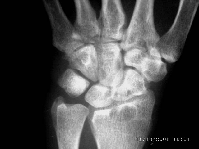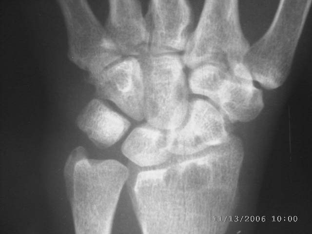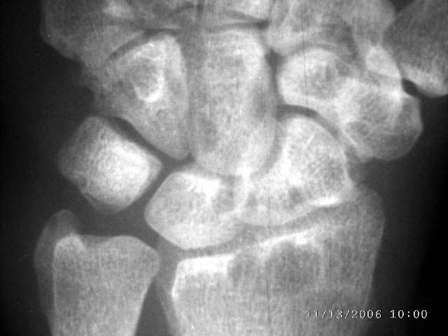 再补充点鉴别诊断思路:透析性骨关节病.透析性骨关节病容易在腕关节处出现淀粉样变性,造成出现腕管综合症,实际本病例的临床症状就是腕管综合症的表现,腕骨也可以出现同本病例的类似x光表现,当然透析病史很重要,且一般要10年以上出现透析性骨关节病的可能性大.实际上本病例很早即有症状,故骨内腱鞘囊肿形成较早,范围可能没现在广而已.
