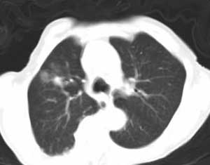 患者,女,69y,居住农村,胸闷,咳嗦,自述无发热,有慢支。患者消瘦,体制弱。