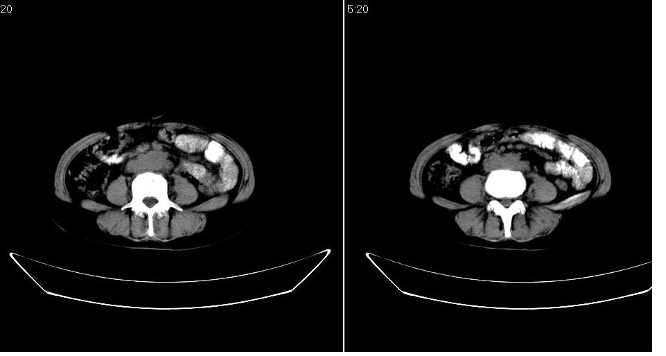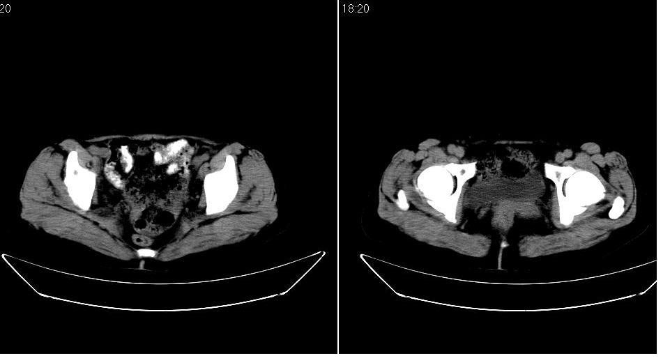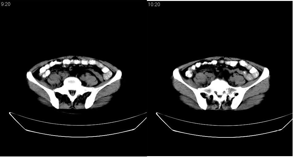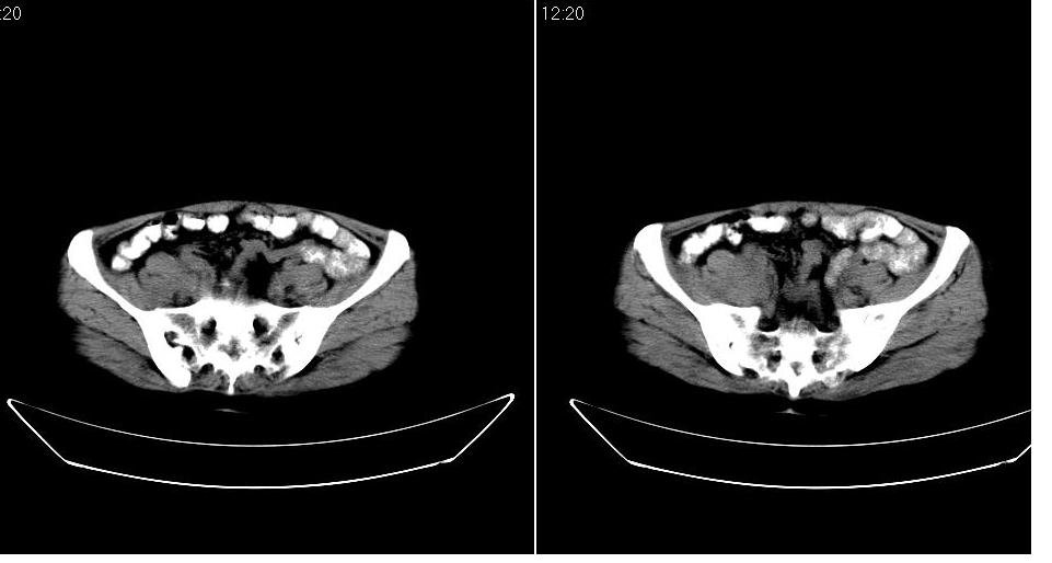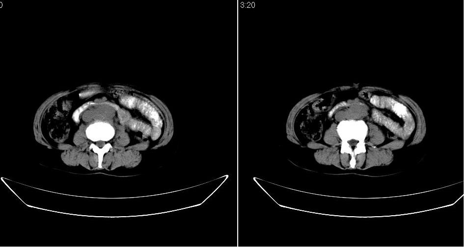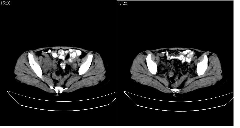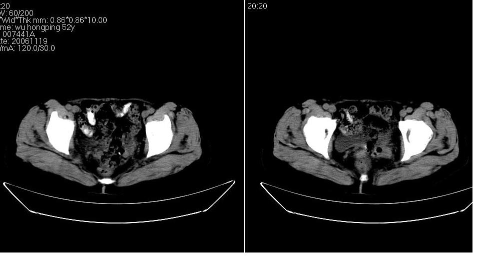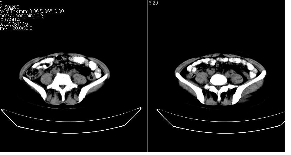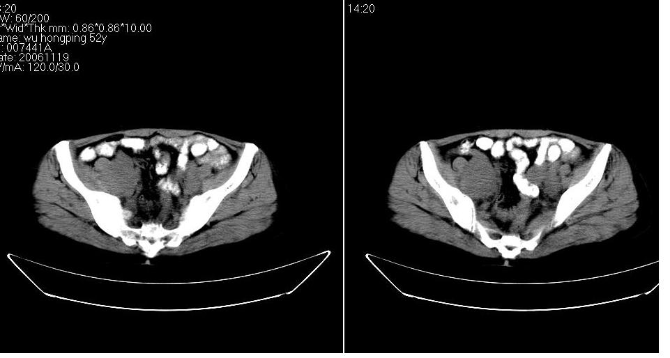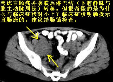 以下是引用zyx168在2006-11-20 9:27:00的发言:[br]双侧盆腔均可见不规则形软组织肿块影,似为结节状影融合而成,但以右侧为甚,腹主动脉与下腔静脉周围亦可见多个肿大淋巴结.[br]结合临床手术史考虑:盆腔与腹膜后多发性淋巴结转移(原发灶可能是原来的\"子宫肌瘤\"恶变或并非\"子宫肌瘤\";回盲部肿瘤不排除)[br]