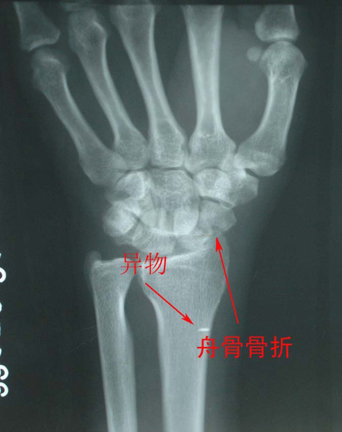 我赞同是1、“经舟骨月骨周围脱位”,表现为月骨周围脱位拌舟骨骨折,且骨折远段随头骨向后脱位,而骨折近段与桡骨、月骨关系保持正常。2、软组织内金属异物。