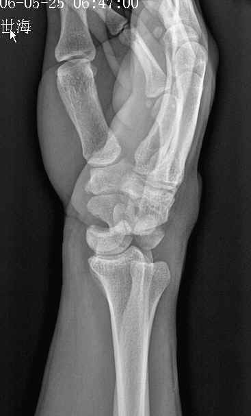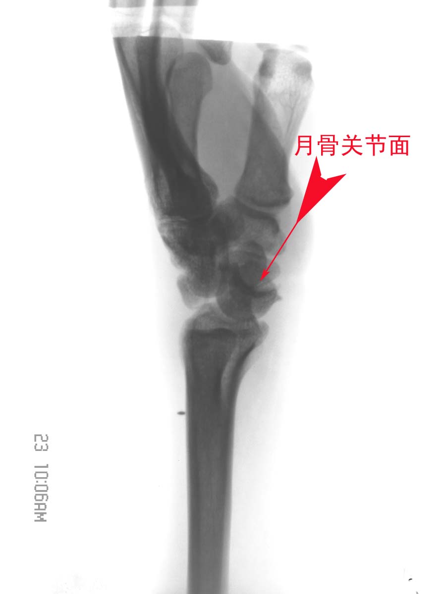 2). 经舟骨月骨脱位:除月骨脱位外,同时伴有舟骨骨折,且骨折近段随月骨一起向前脱位,骨折远段仍处于原位置。