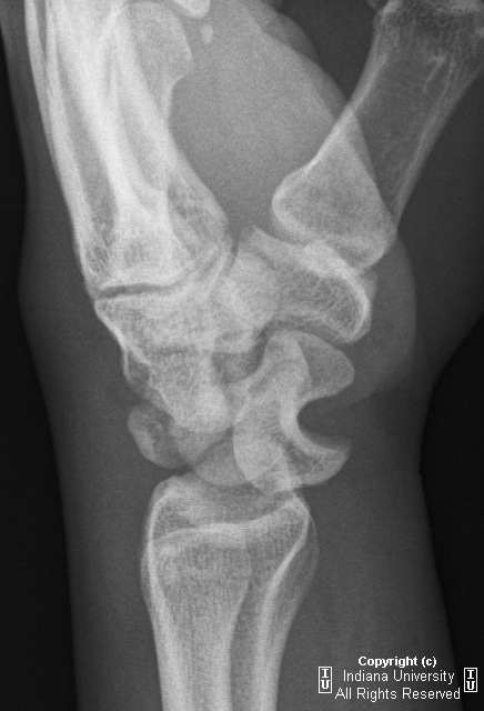 5 ).混合性脱位:月骨周围脱位,月骨也有半脱位。甚至有腕骨骨折、尺桡骨骨折、尺桡下关节脱位等。