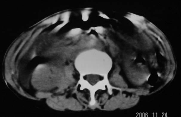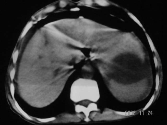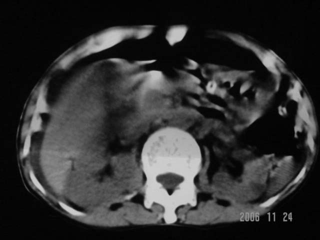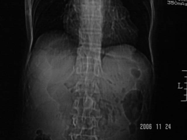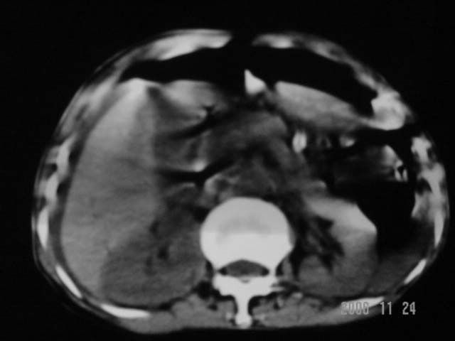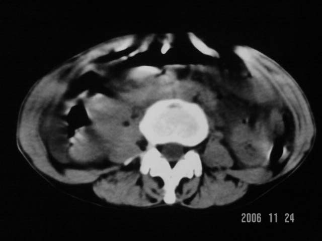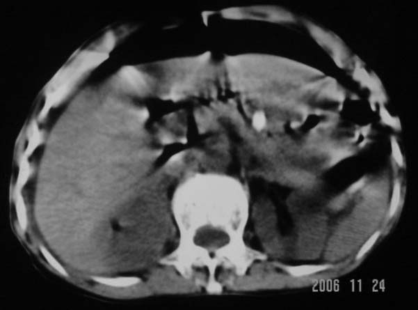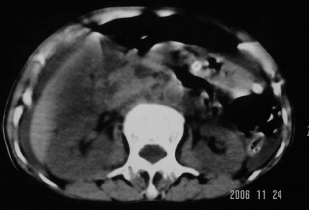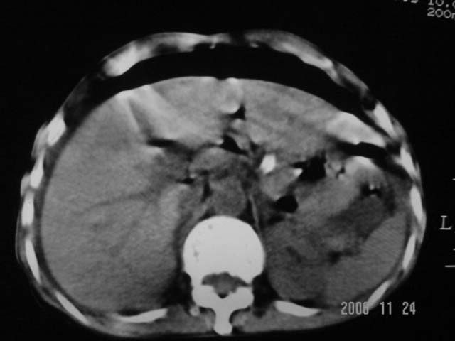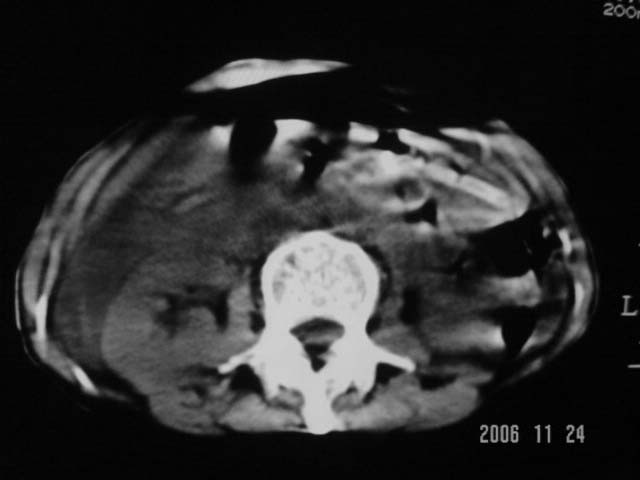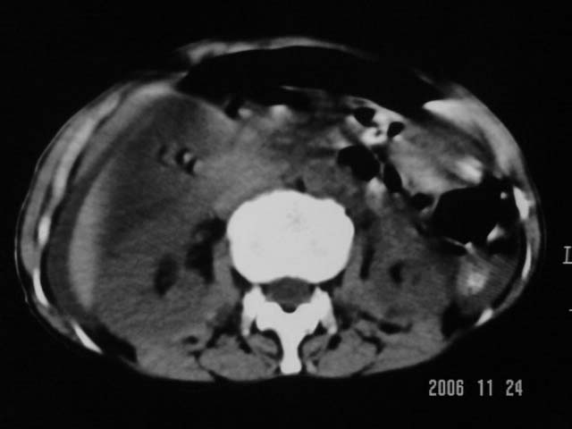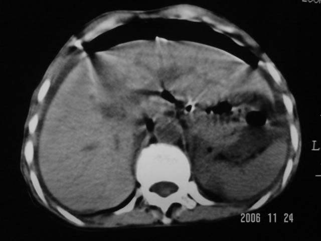 支持楼上分析:以下是引用zjzjr在2006-11-24 20:48:00的发言:[br]仰卧位见:肝前间隙及肝脾间隙内可见新月形气体密度影,边缘清楚,侧卧位见气体随体位改变而移动,ct值约-929hu。膈下、肝下间隙及部分肠间隙可见液性密度影。考虑:1、上腹部空腔脏器穿孔,以胃穿孔可能性大。2、少量腹水。