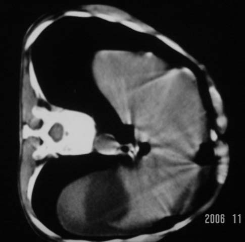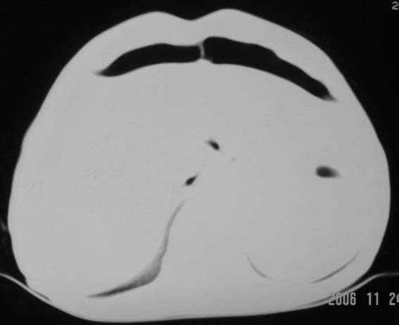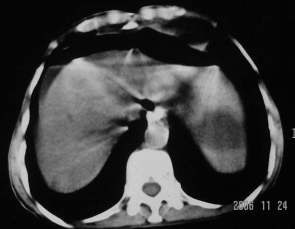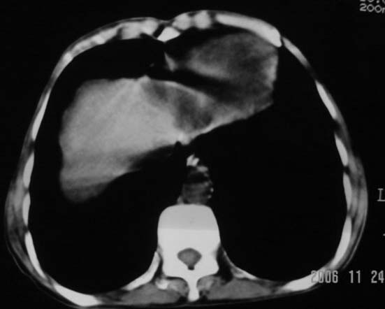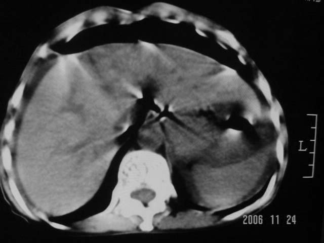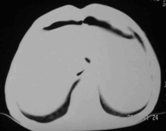 肝前间隙及肝脾间隙内可见新月形气体密度影,边缘清楚,侧卧位见气体随体位改变而移动,