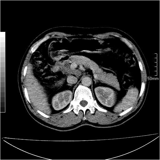 男性,54岁,皮肤黄染,搔痒一周余.b超示肝左叶回声异常.初步诊断1胆总管下段结石2胆囊结石伴慢性胆囊炎请各位战友帮忙看一下肝脏多发低密度如何解释恰当.增强效果不是很好.请大家见谅.
