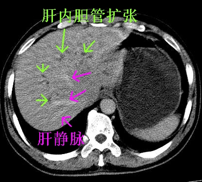 [br]胆总管结石,致肝内外胆管增粗,胆内低密度影建议增强扫描