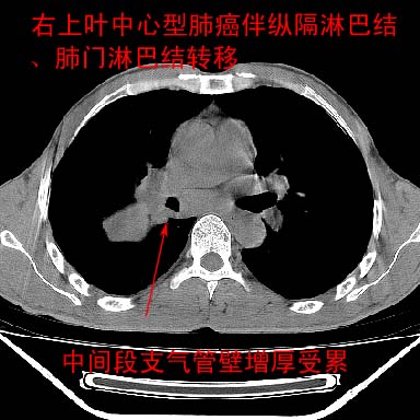 以下是引用lpc0ct在2006-11-28 16:12:00的发言:[br]大家图文并貌分析的太全面了,没有可说的,同意 [br] 右肺上叶中心型肺癌伴肺门、纵隔淋巴结转移.[br]