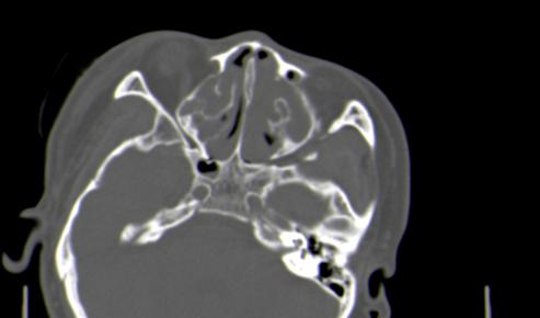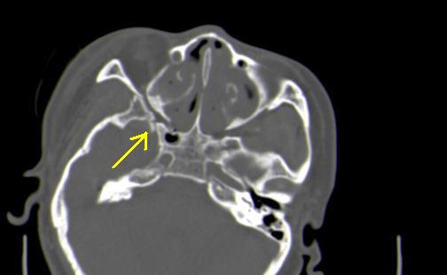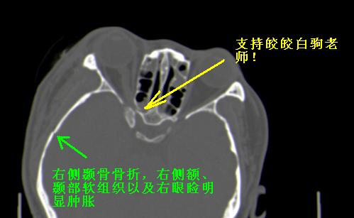 以下是引用守望可可西里在2006-11-29 9:46:00的发言:[br][quote]以下是引用皎皎白驹在2006-11-29 8:48:00的发言:[br]影像表现:双侧筛窦和上颌窦、鼻腔内均密度增高,右侧视神经增粗、弯曲,左筛窦顶部筛板及右侧纸板近视神经孔区可见骨折线。[br]结合临床表现考虑:右侧筛窦纸板近视神经孔区骨折致右侧视神经损伤。最好做个眼眶冠状扫描,更明确右侧视神经管是否狭窄。