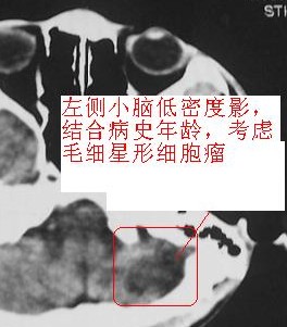 左侧小脑半球低密度影,占位不明显,但不能排除肿瘤,我诊断胶质瘤,脑炎及脑梗临床不符.