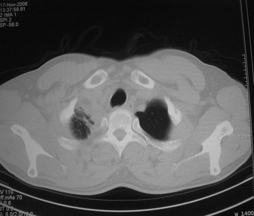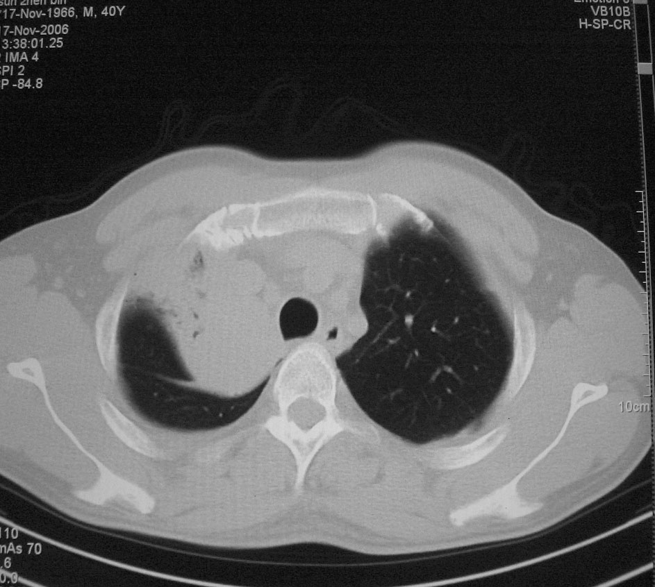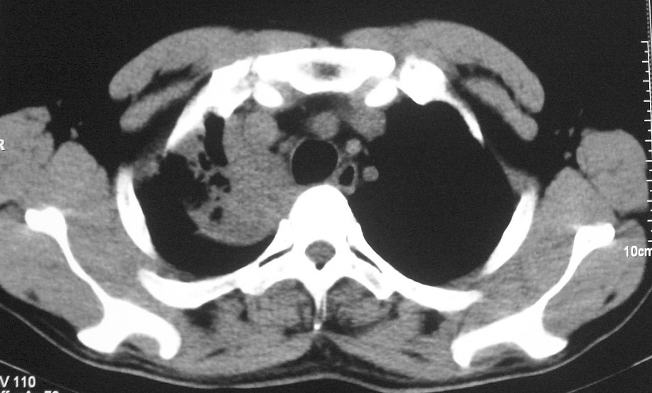 右肺上叶中央型肺癌并阻塞性炎症、阻塞性肺不张……