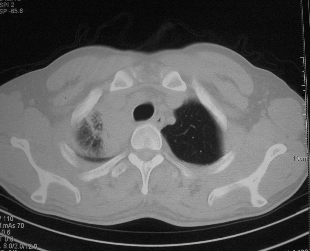 右上叶支气管肺癌并右上叶阻塞性不张,右侧少量胸腔积液.