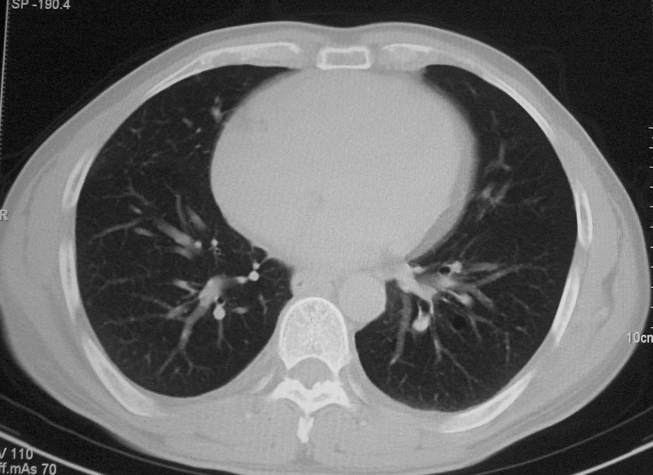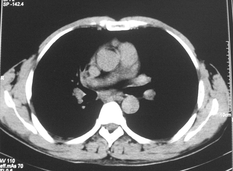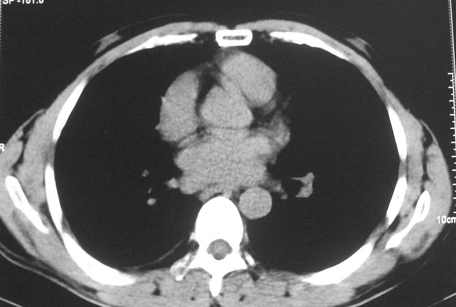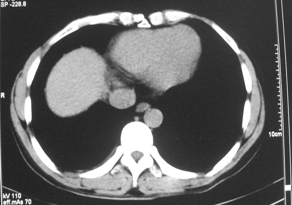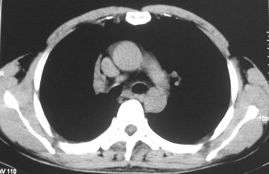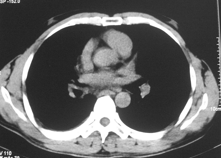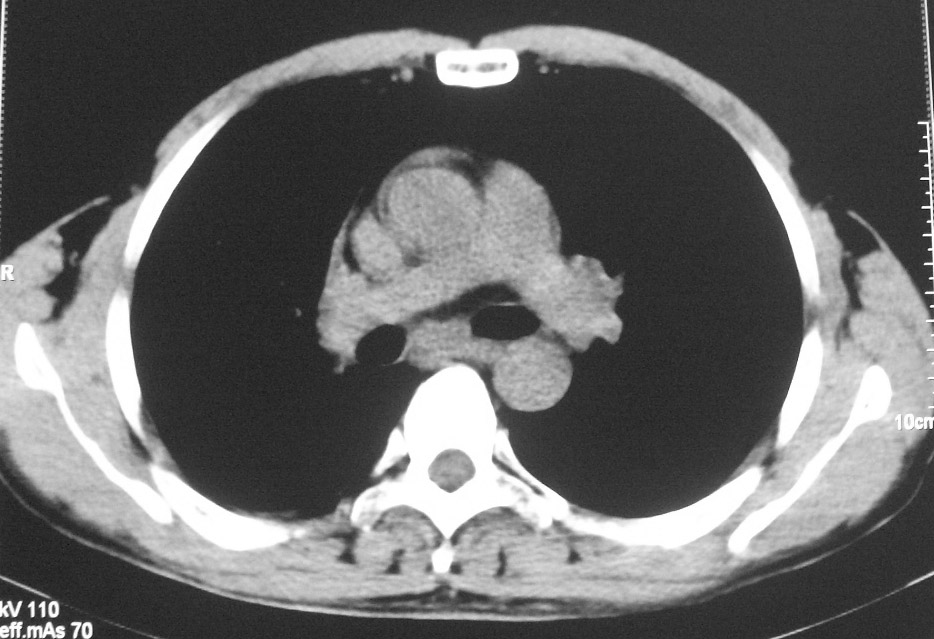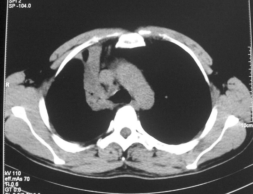 右肺上叶支气管后壁增厚,呈鼠尾状狭窄,纵隔内未见明显增大的淋巴结影,考虑为中央型肺癌伴右上肺不张